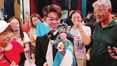 天津青年戏剧节上,市民近距离了解布袋木偶的幕后技艺。